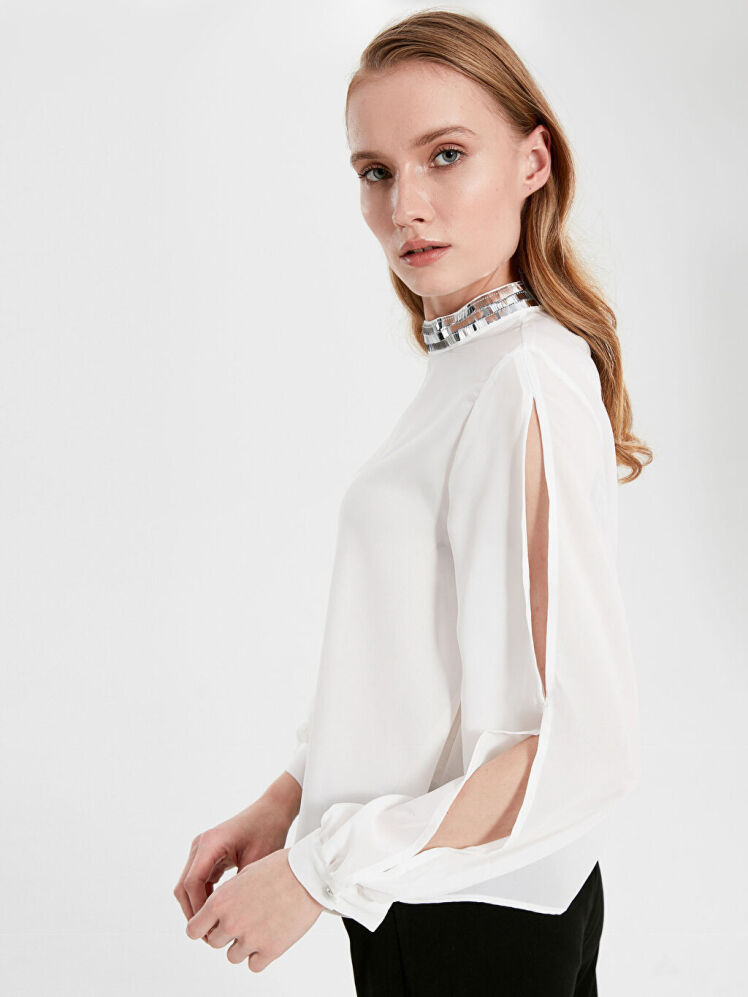 قواره این شومیز زنانه رگولار است و مانکن داخل تصویر سایز اس بر تن دارد. شومیز السی وایکیکی دارای یقه سه سانت و چاک بر روی آستین هاست
