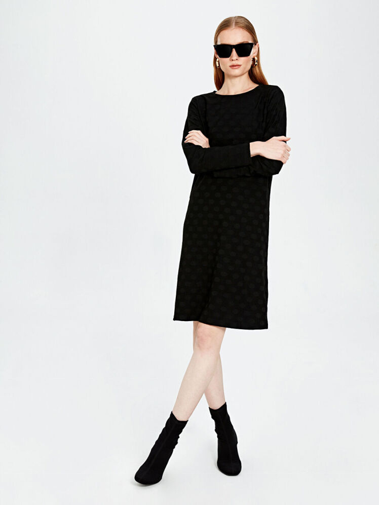 قد این پیراهن زنانه ال سی وایکیکی تا بالای زانوست و آستر آن بدون خط است. بر روی پارچه این پیراهن زنانه طرح دایره های همرنگ وجود دارد که زیبایی خاصی به آن بخشیده است.