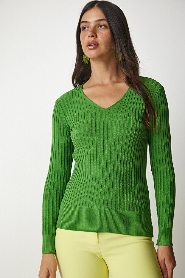 بلوز زنانه LovelyIstanbul، بلوز وی یقه فیتیلی، بلوز سبز روشن، V Yaka Bluz، Fitilli Basic Bluz