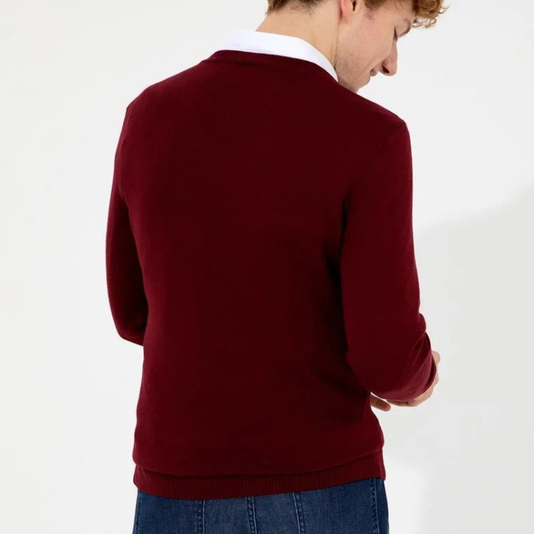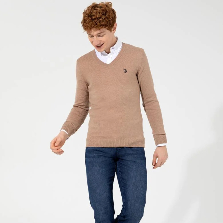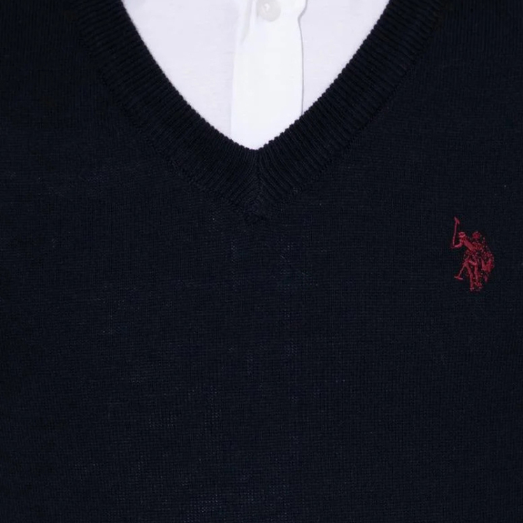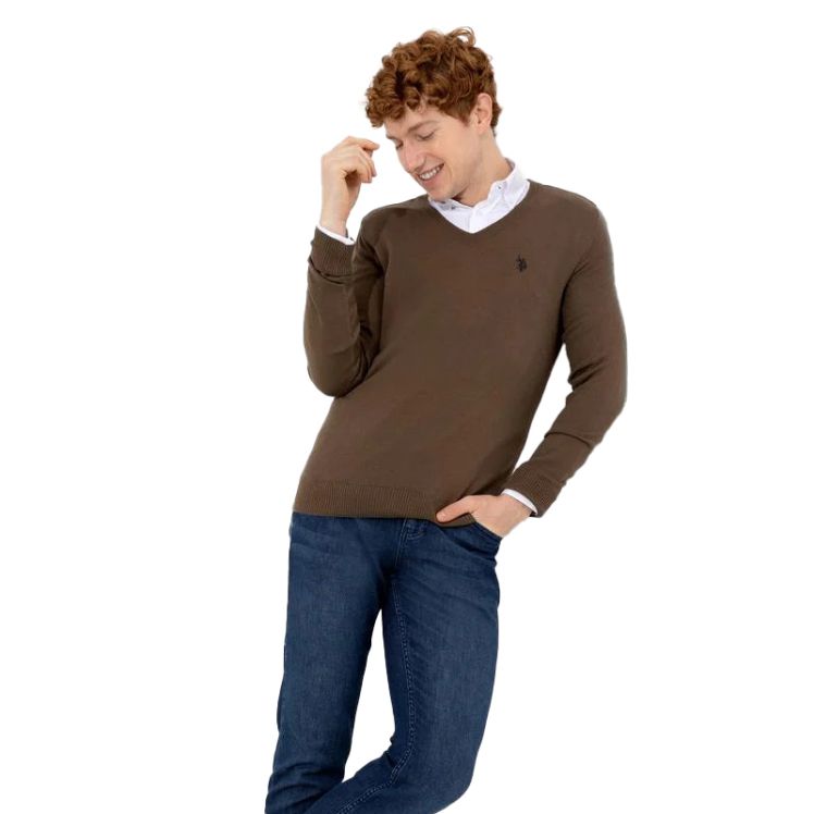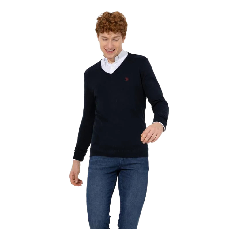 مدل این پلیور یقه هفت مردانه یو اس پولو ساده و دارای قواره اسلیم یا راسته است.