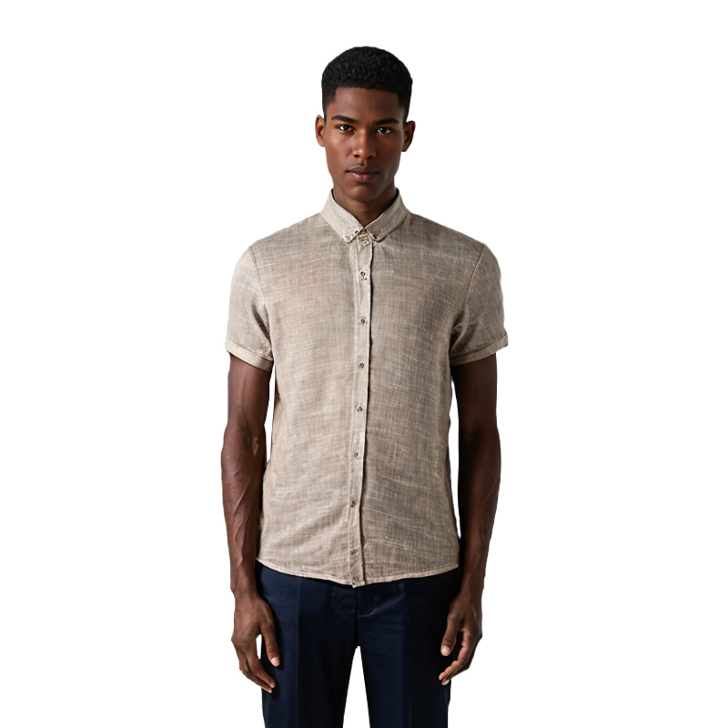 این پیراهن آستین کوتاه مردانه دارای یقه برگردان است.