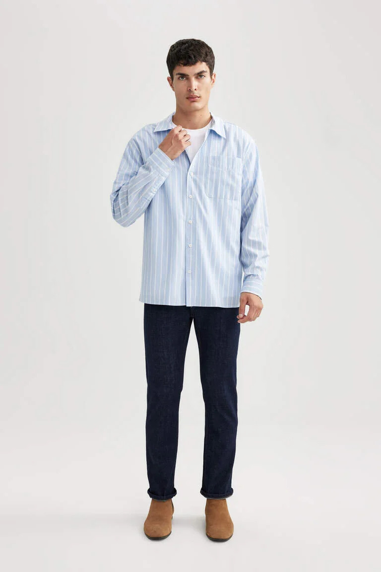 قواره پیراهن مردانه دفکتو رگولار است. پارچه این پیراهن دفکتو از پارچه راه راه تهیه شده است.