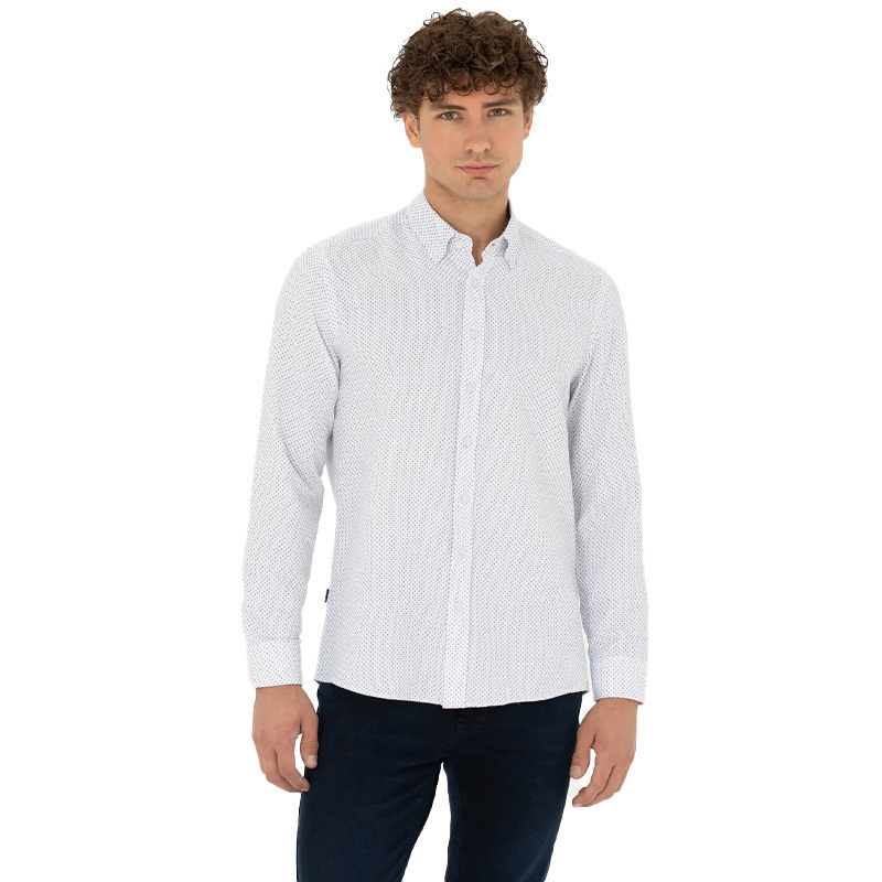 پیراهن آستین بلند مردانه پیر کاردین دارای قواره اسلیم فیت است و به صورت راسته در تن قرار می گیرد.