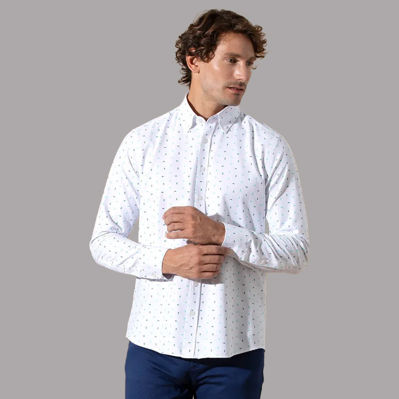 پیراهن آستین بلند مردانه پیر کاردین دارای قواره اسلیم فیت است و به صورت راسته در تن قرار می گیرد.