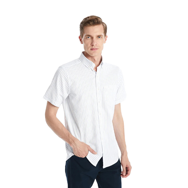 پارچه این پیراهن آستین کوتاه مردانه بافت نازکی دارد و مناسب فصل تابستان است. طرح پارچه راه راه با راه های آبی کمرنگ است.