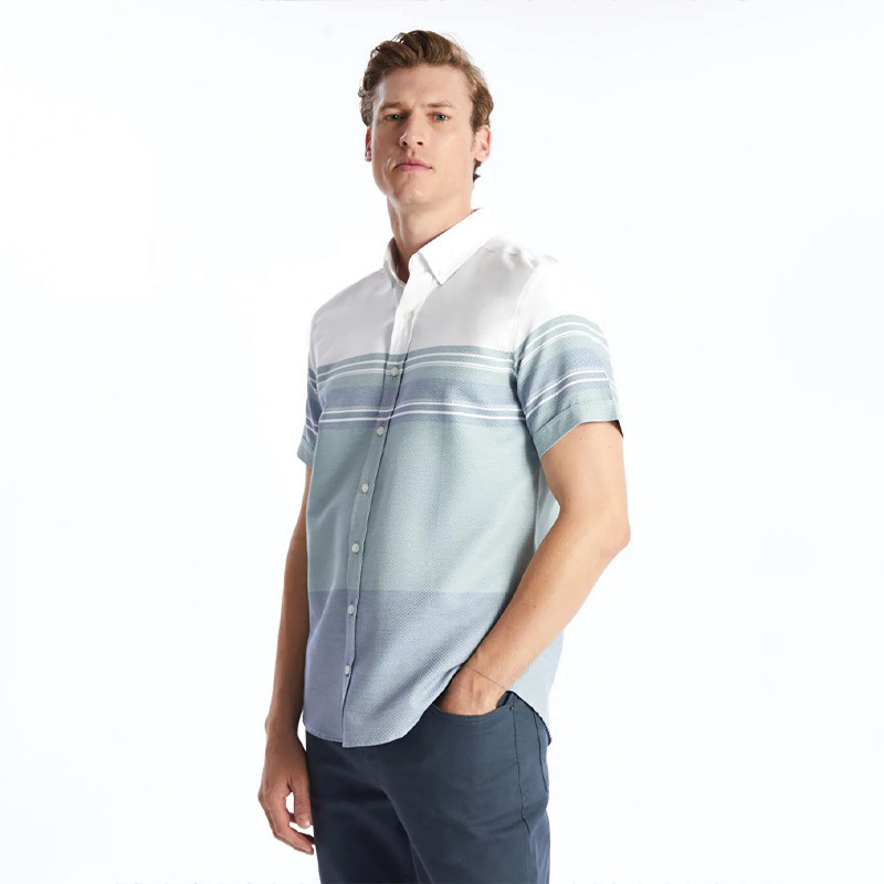 پارچه این پیراهن آستین کوتاه مردانه بافت نازکی دارد و مناسب فصل تابستان است. طرح پارچه راه راه افقی با راه های آبی و سبز است.