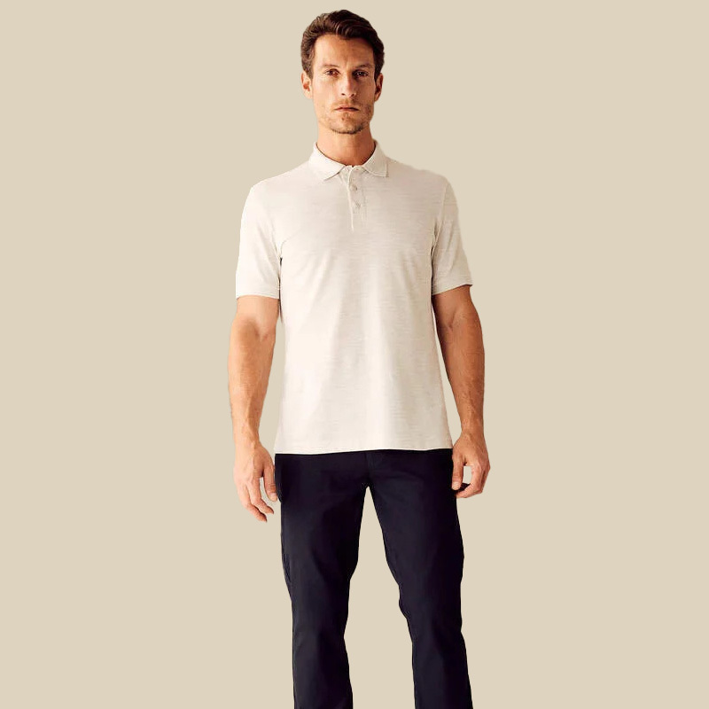 مدل داخل تصویر پولوشرت مردانه دفکتو سایز ام بر تن دارد. قواره این پولوشرت ال سی استاندارد یا رگولار است.
