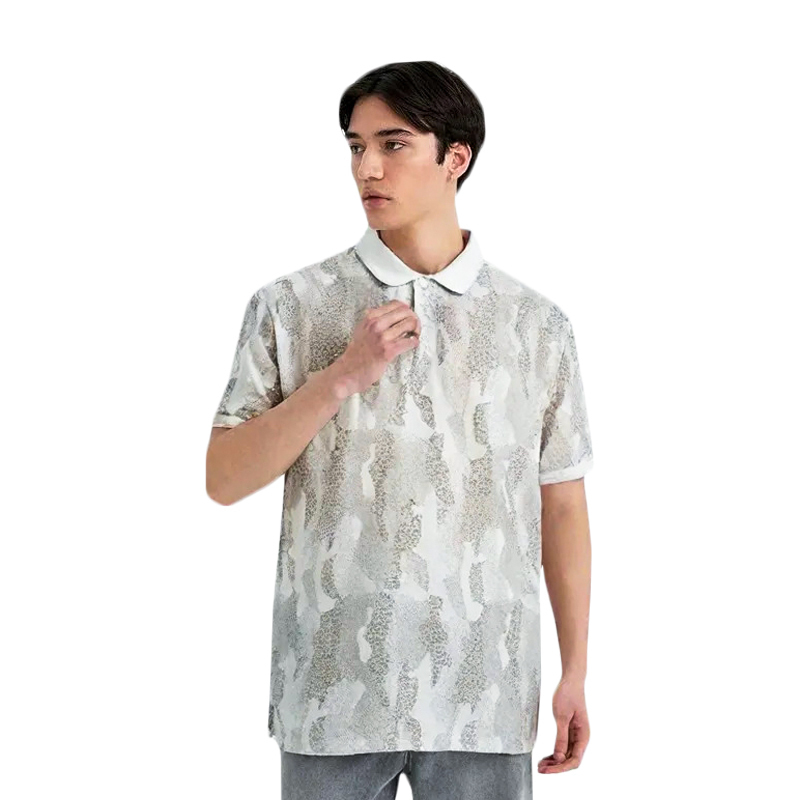 این پولوشرت آستین کوتاه مردانه دارای یقه برگردان است و با سه دکمه بسته می شود.