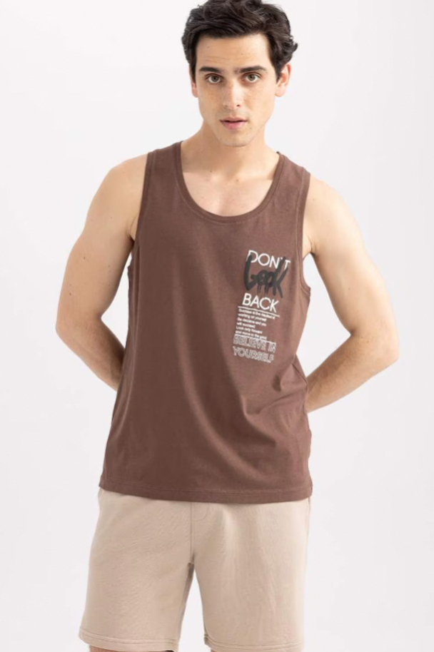 مدل داخل تصویر تی شرت مردانه السی وایکیکی سایز ام بر تن دارد. قواره این تی شرت دفکتو اسلیم فیت یا جذب است.