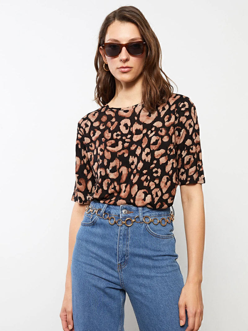 جنس تیشرت پلنگی زنانه ال سی پارچه حریر و نخ های ویسکوز است.