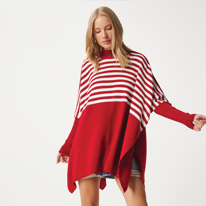 این پانچو راه راه قرمز را با یک شلوار لگینگ مشکی یا جین جذب (Skinny) ست کنید تا تعادل میان بالاتنه آزاد و پایینتنه حفظ شود. استفاده از یک نیمبوت لژدار و کلاه بافتنی ساده، استایل خیابانی شما را کامل و بینقص میکند. این لباس برای خانمهای باردار که به دنبال استایل شیک و راحت هستند نیز انتخابی عالی است.